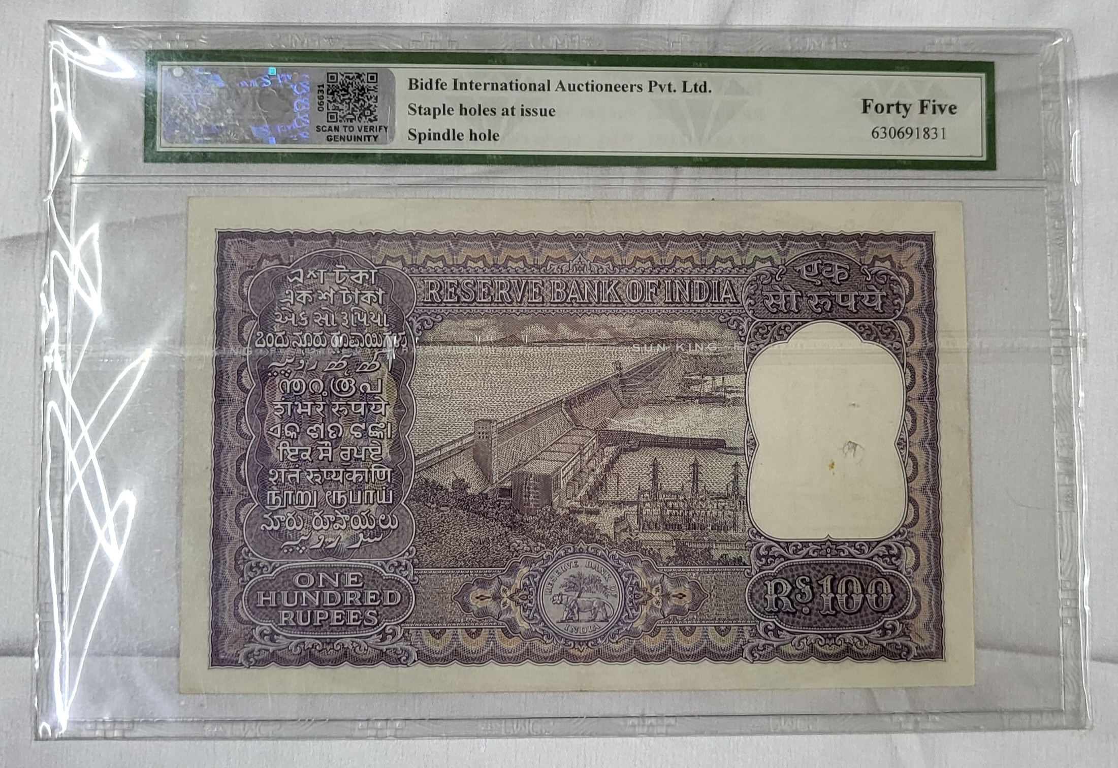 100Rupees 45Extra Fine.      AA10 123451,            Signature H.V.R IYENGAR. Ladder Number .